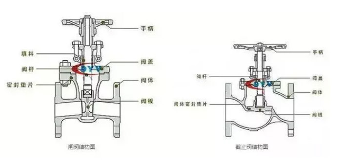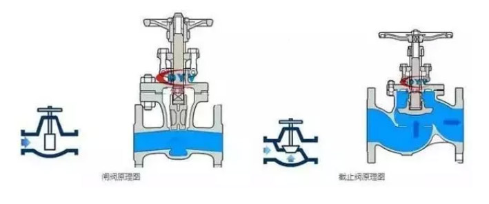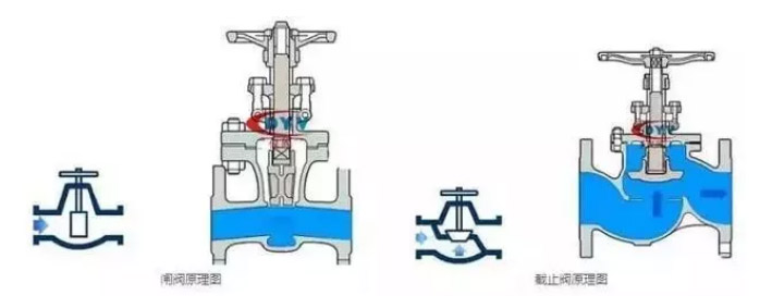 截止閥是低進(jìn)高出,從外觀看有明顯的管道不在一相水平線上。閘閥流道在一個水平線上。閘閥的行程比截止閥的要大。
