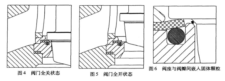 對于夾帶固體顆粒的流體介質(zhì) ,軟閥座閥門的密封結(jié)構(gòu)更為重要。這主要是因?yàn)榻橘|(zhì)中夾帶有固體顆粒時(shí) ,極容易卡在閥瓣和閥座的密封面之間 ,妨礙了閥座的密封 ,會(huì)引起泄漏 ,繼而由于介質(zhì)的高速?zèng)_刷而使閥座表面被沖蝕破壞。對于上述具有二級關(guān)閉作用的軟閥座密封結(jié)構(gòu) (圖 6) ,即使出現(xiàn)了這種顆粒卡在閥瓣和閥座金屬密封部位之間 ,也不會(huì)有什么危害 ,因?yàn)檫€有閥瓣和軟閥座之間的密封 ,仍能起到可靠有效的補(bǔ)充密封作用。