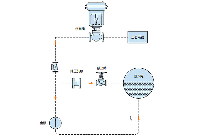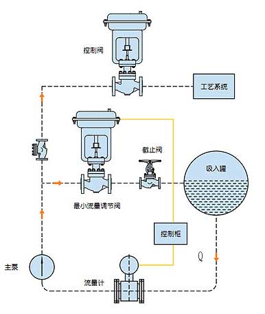 控制循環(huán)系統(tǒng)由止回閥、流量計、最小流量調(diào)節(jié)閥、控制系統(tǒng)組成??刂蒲h(huán)系統(tǒng)能夠提供最小流量保護,當(dāng)工藝流量大于泵的最小流量時,回路關(guān)閉沒有額外的能量損失。但系統(tǒng)復(fù)雜,控制元件多,購買、安裝、維護費用成本比較高。